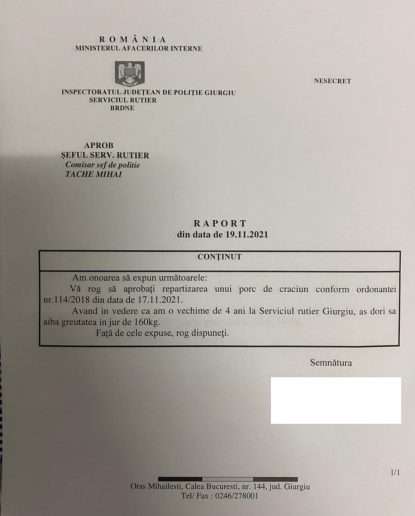 Un agent de la Poliția Rutieră Giurgiu a scris un raport în care a solicitat să îi fie repartizat un porc de Crăciun, scrie Giurgiu News.