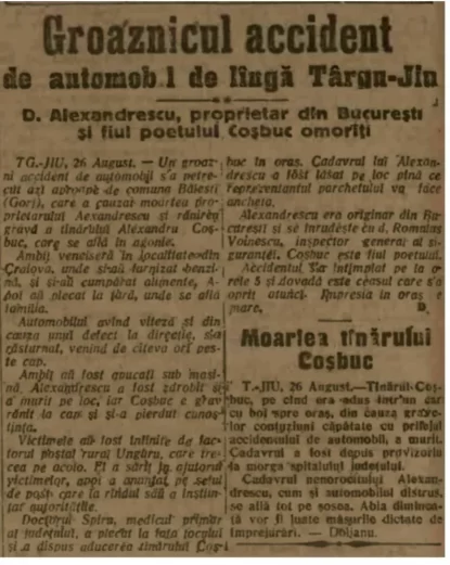 Pe raza localității Tămășești, Gorj, Alexadrescu era la volan și, încercând să evite brusc o căruță, mașina s-a lovit de o piatră mare și s-a răsturnat, iar șoferul a murit pe loc. Într-un car cu boi, așezat pe paie și perne, Alexandru Coșbuc a fost transportat la spitalul din Târgu Jiu, fiind lovit grav la cap. Din păcate, și-a dat ultima suflare pe treptele spitalului.