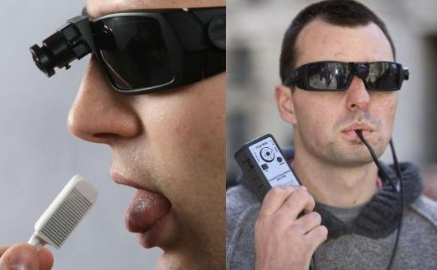 Montată pe o pereche de ochelari, o cameră video transmite unui software imagini pe care acesta le transform în semnale electrice care ajung într-un mic dispozitiv ce trebuie aplicat pe limbă.
