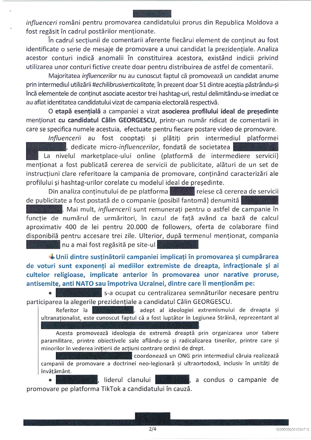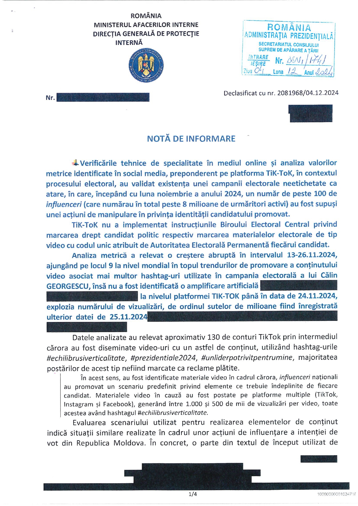 Revenind la documentul desecretizat, acesta mai arată că liderul unui clan interlop a condus o campanie de promovare pe TikTok a candidatului și a incintat la manifestații de protest după primul tur cu mesajul că alegerile sunt fraudate.
