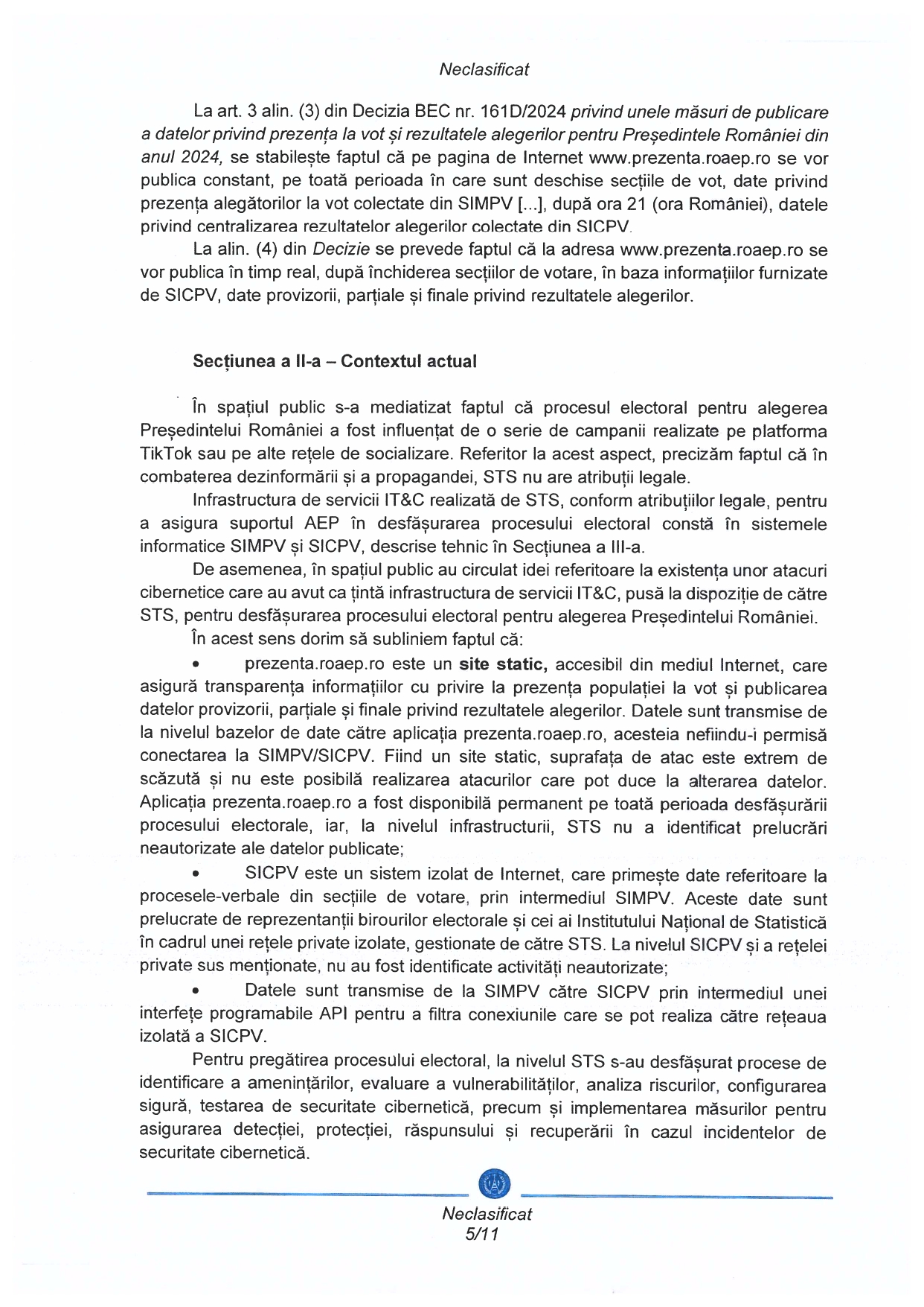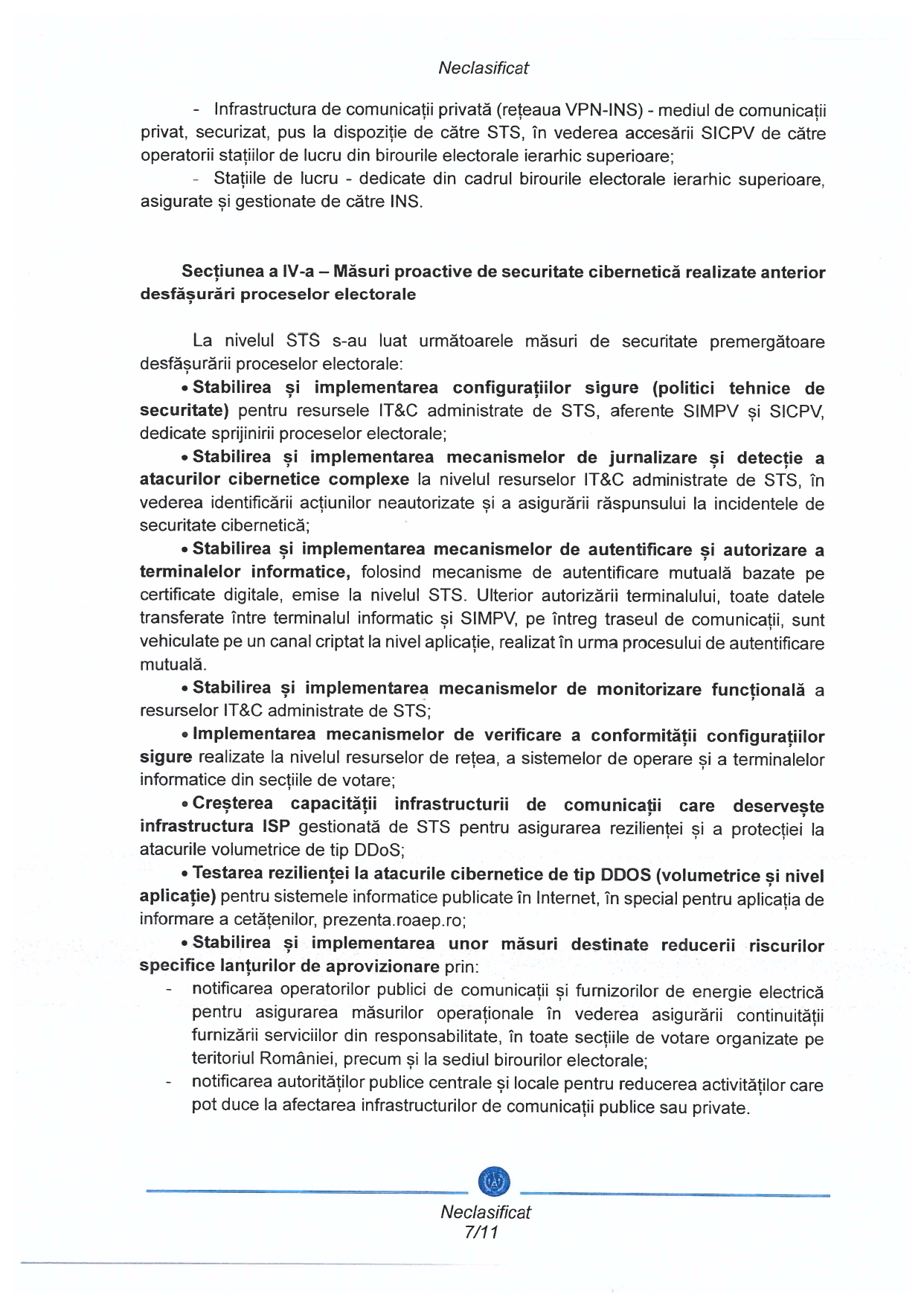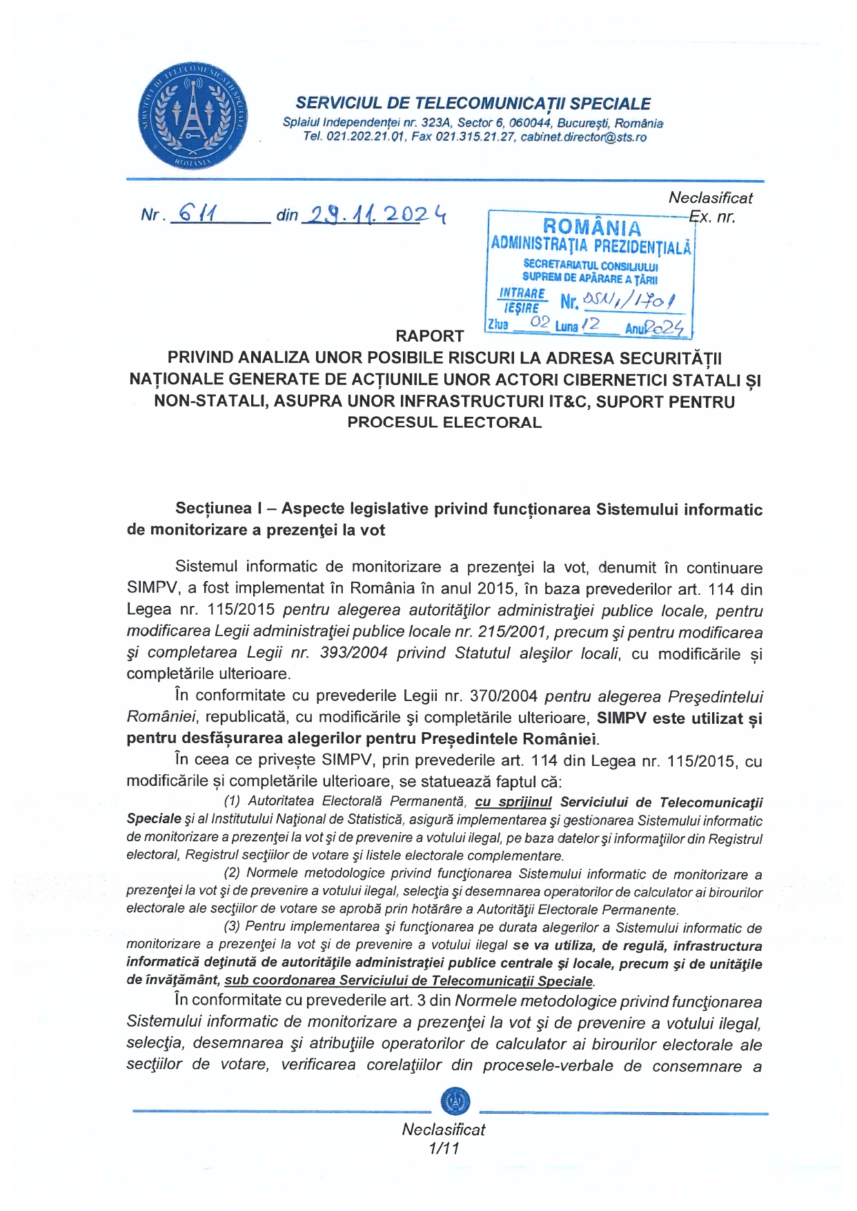 Un document desecretizat de Președinția României aparține Serviciului de Telecomunicații Speciale. Deși STS nu are atribuții legate de combaterea dezinformării și a propagandei, Serviciul – care trebuie să asigure corectitudinea procesului electoral – informează că, în timpul alegerilor, au fost identificate atacuri cibernetice blocate cu succes, care nu au reușit să altereze rezultatul votului.