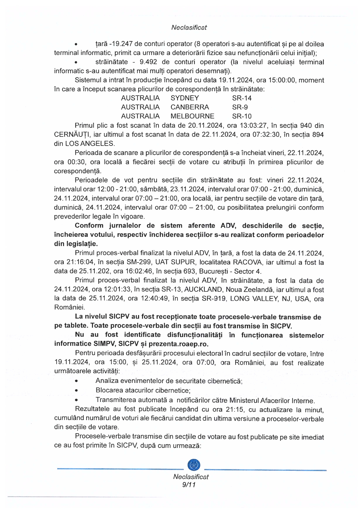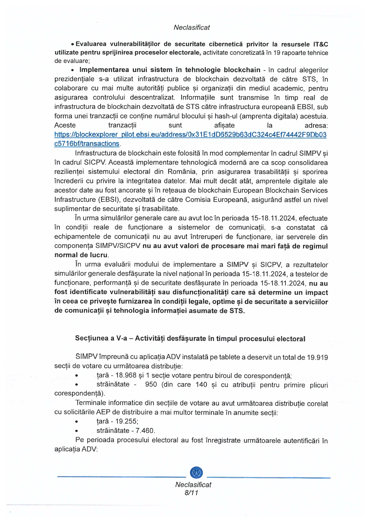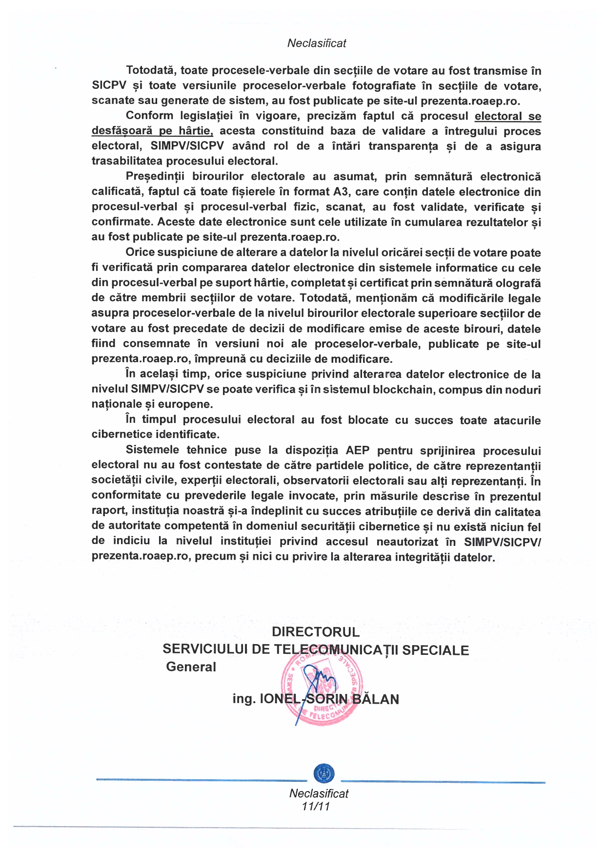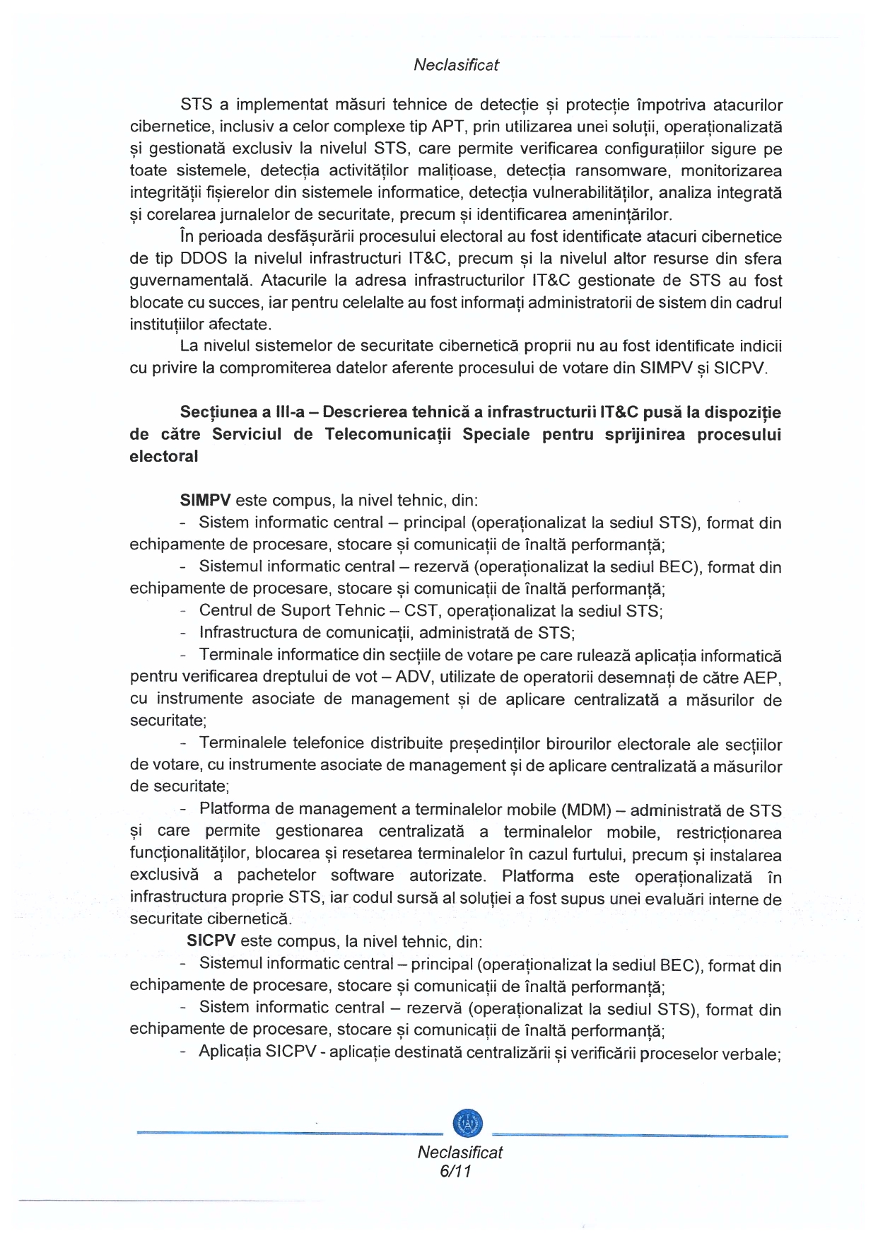 Un document desecretizat de Președinția României aparține Serviciului de Telecomunicații Speciale. Deși STS nu are atribuții legate de combaterea dezinformării și a propagandei, Serviciul – care trebuie să asigure corectitudinea procesului electoral – informează că, în timpul alegerilor, au fost identificate atacuri cibernetice blocate cu succes, care nu au reușit să altereze rezultatul votului.
