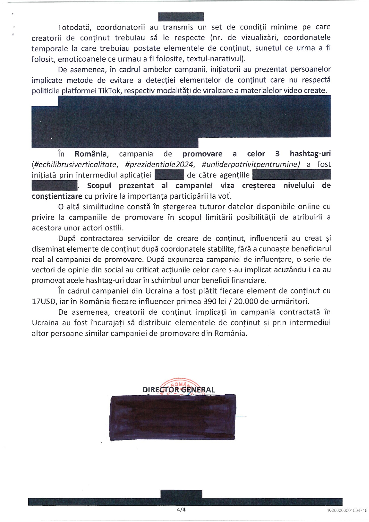 Trecem la Nota de Informare a Direcției Generale de Protecție Internă din cadrul Ministerului de Interne, care amintește că s-a desfășurat o campanie nemarcată ca atare, cu peste 100 de influenceri care aveau peste 8 milioane de urmaritori activi.