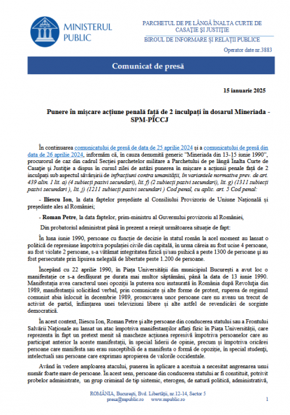 Parchetul General anunţă, miercuri, că s-a dispus urmărirea penală a lui Ion Iliescu, fost preşedinte al României, şi a lui Petre Roman, fost premier, în Dosarul Mineriadei, fiind acuzaţi de infracţiuni contra umanităţii. Noi audieri în dosarul Mineriadei. Fostul premier Petre Roman și fostul vicepremier Gelu Voican-Voiculescu au fost chemați astăzi la Parchetul General pentru a li se aduce la cunoștință calitatea de inculpați. Sunt acuzați de săvârșirea de infracțiuni contra umanității după ce alături de președintele de la acea vreme, Ion Iliescu, au dat ordin pentru reprimarea violentă a celor manifestau în piața Universității și strigau: „Jos Iliescu!”, „Jos Comunismul!”. Ion Iliescu a fost audiat acasă.
