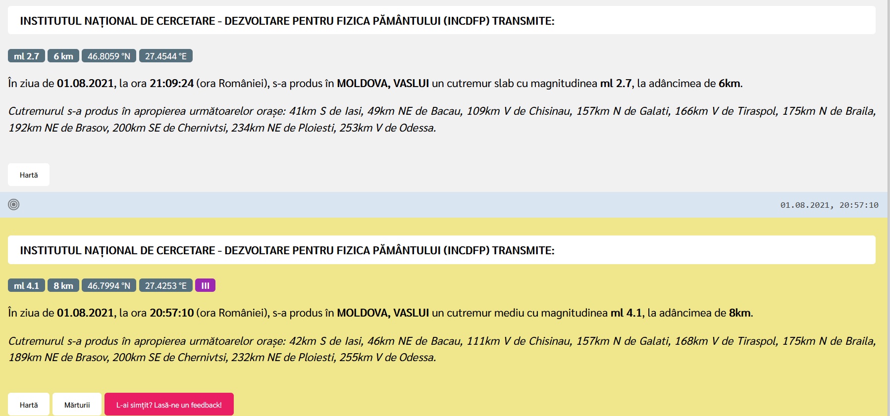 Având magnitudinea 4,1 și 2,9, două cutremure s-au produs, duminică seara, în zona Moldovei.
