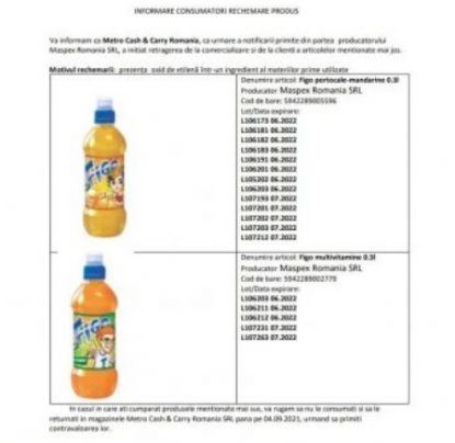 Această substanţă se regăseşte într-un ingredient al materiilor prime folosite. Băuturile erau vândute sub mărcile Figo și Fruits & Friends şi sunt destinate în special copiilor.