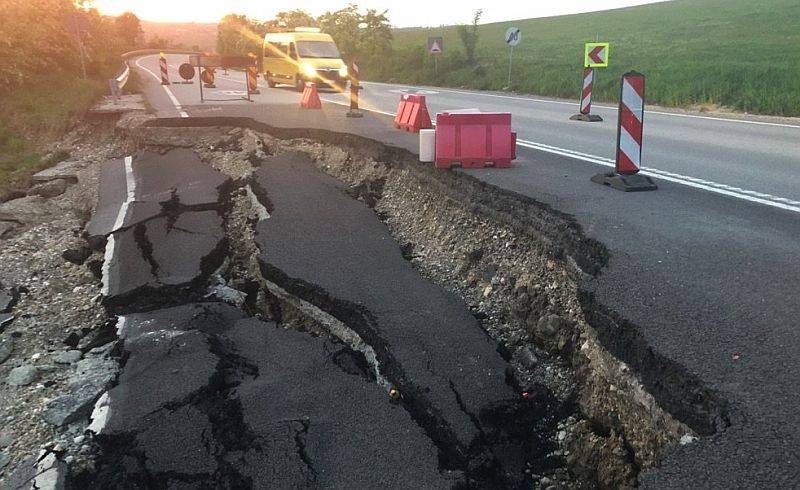 Zilele trecute, drumul a cedat în mai multe locuri, iar o porțiune de câțiva metri pătrați s-a surpat și a căzut cu tot cu asfalt și terasament în râpa din apropierea șoselei. În prezent, se circulă pe un singur sens.