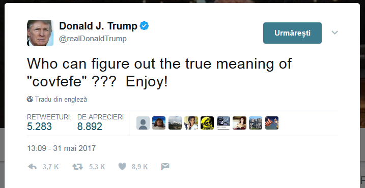 Un mesaj publicat de preşedintele american Donald Trump în noaptea de marţi spre miercuri, pe Twitter, a devenit viral, utilizatorii reţelei de socializare întrebându-se ce a vrut să spună liderul de la Casa Albă. “În ciuda presei negative constante covfefe”, a scris Trump puţin după miezul nopţii, ora Washingtonului (7 ora României). Mesajul s-a încheiat aici, iar liderul de la Casa Albă nici nu l-a explicat, nici nu l-a continuat.