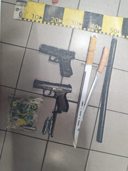 De asemenea, în grupul sanitar al unui spațiu comercial din proximitate, au fost descoperite și ridicate mai multe obiecte interzise la deținere: două pistoale de tip airsoft (nesupuse autorizării), o macetă și alte obiecte contondente.