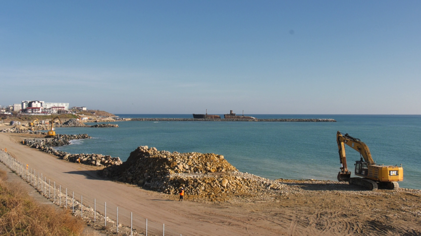 Primul dig, aproape finalizat, a micșorat vizibil distanța dintre țărm și epava navei Evangelia, unul din simbolurile stațiunii Costinești.
