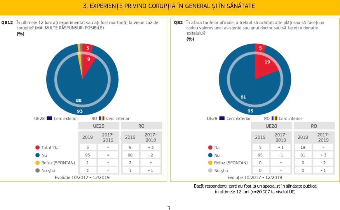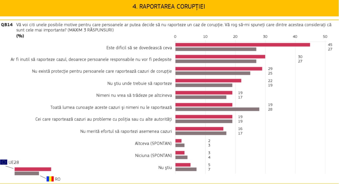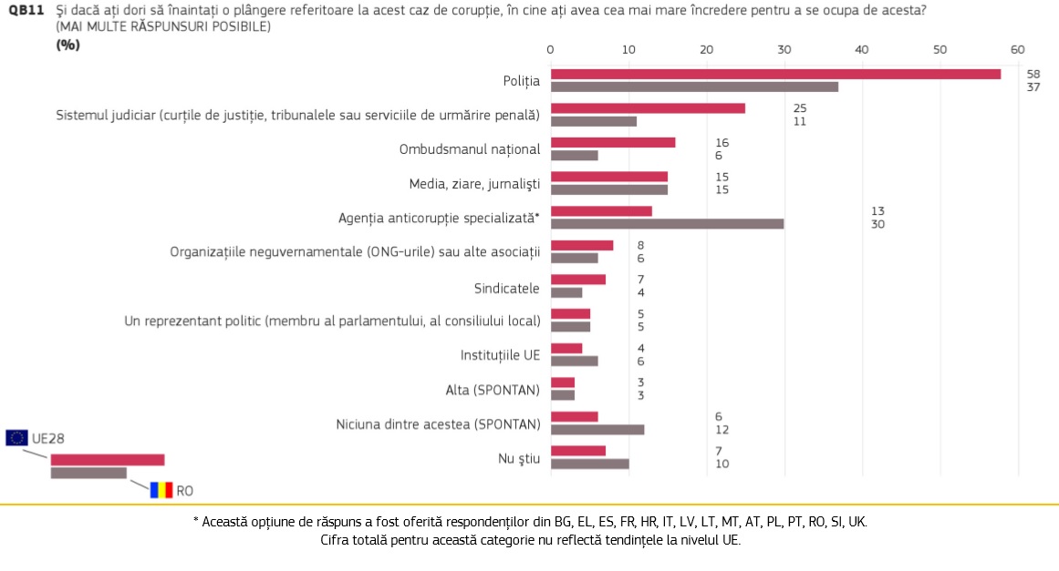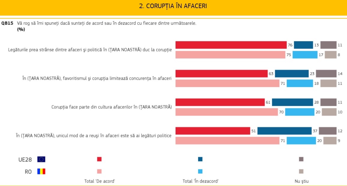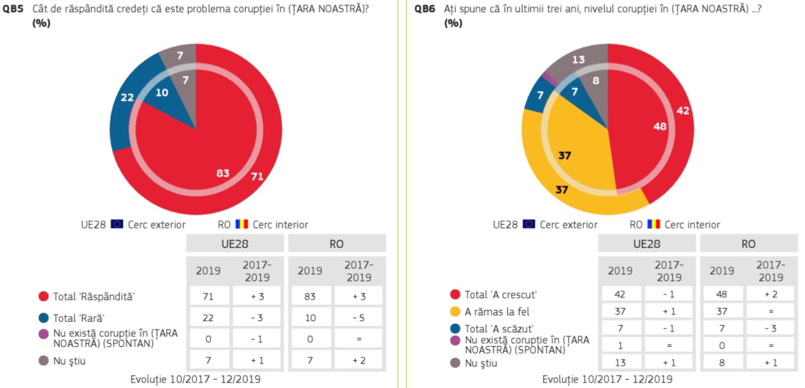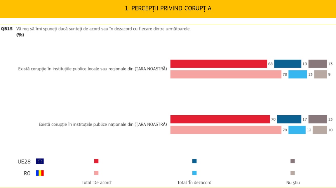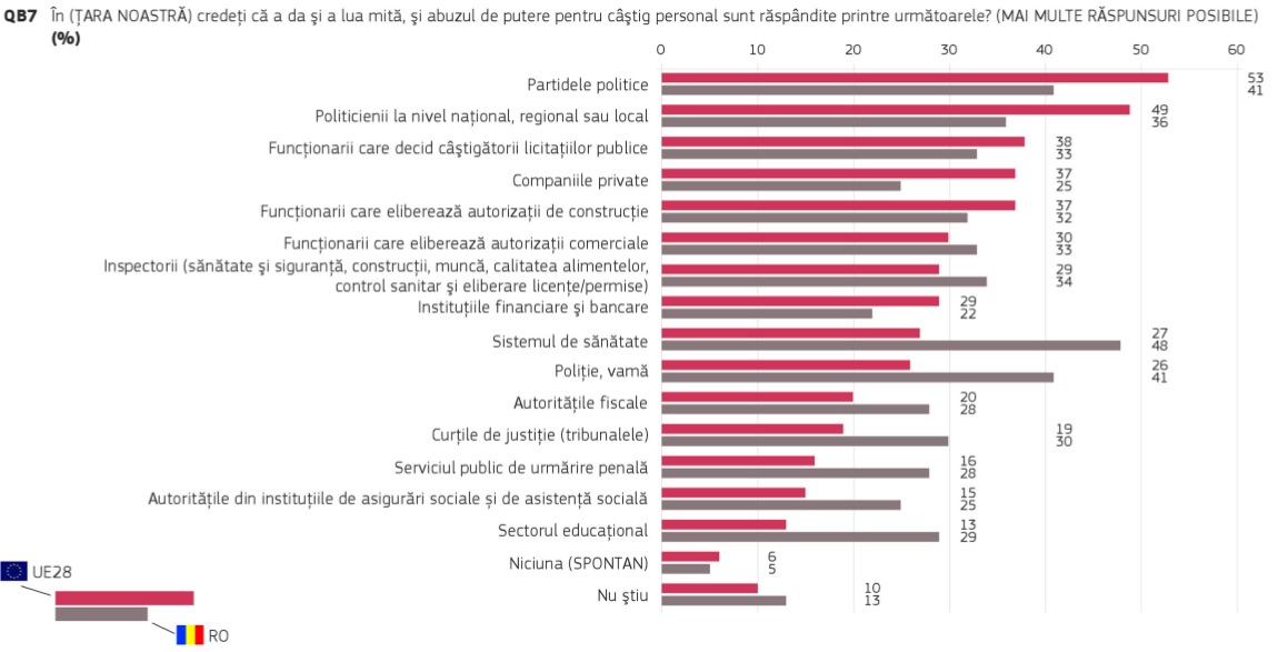 Puțin peste șapte din zece europeni cred că, în țara lor, corupția este larg răspândită și că există corupție în instituțiile publice naționale (70%), dar și în rândul partidelor politice și al politicienilor (53%).