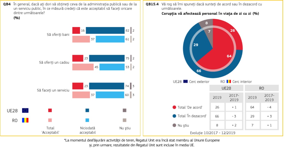 În România, 64% din respondenți susțin că viața de zi cu zi le este afectată de corupție, comparativ cu 26% media europeană.
