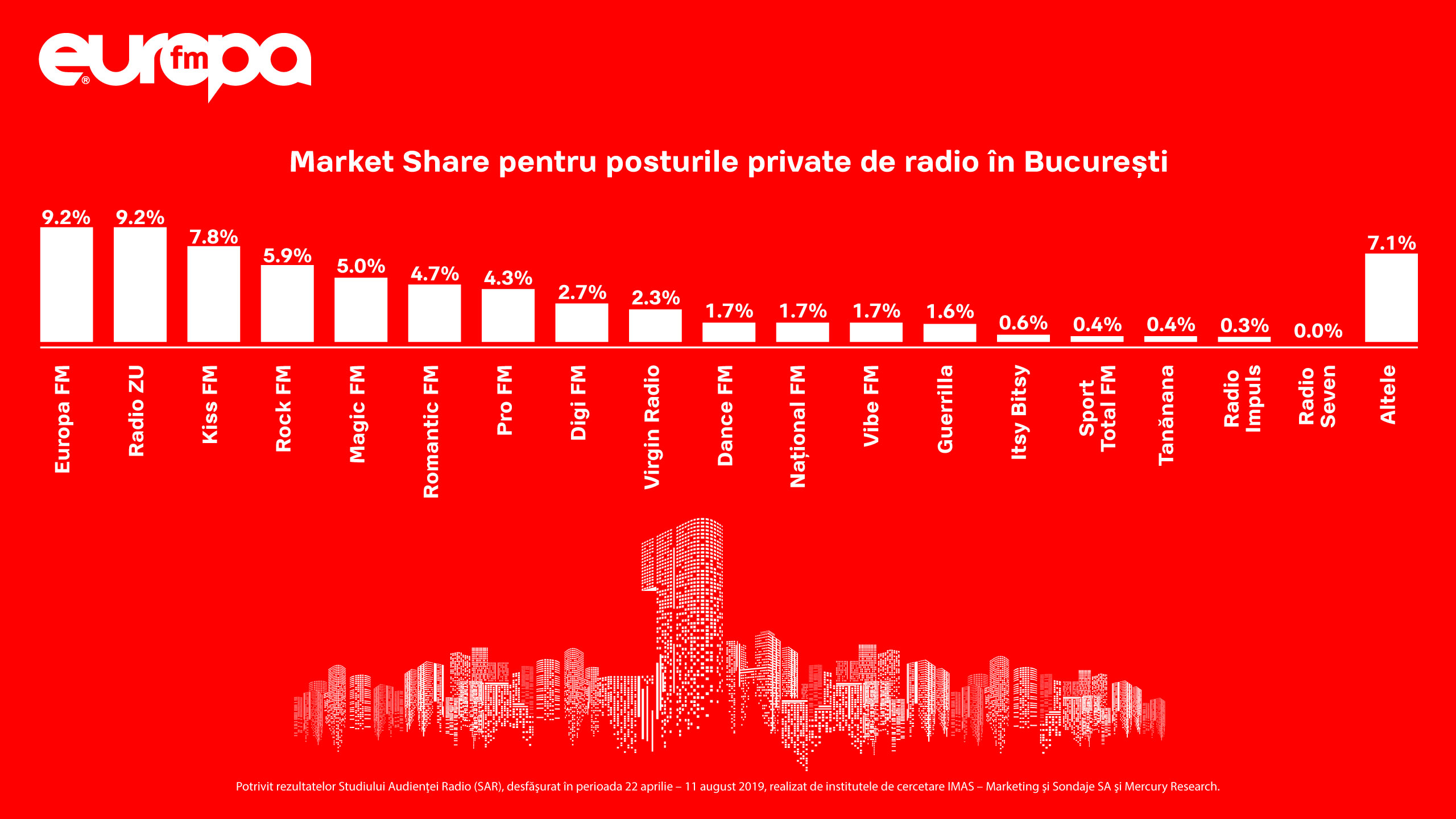 Europa FM ocupă locul 3 în mediul urban, cu o creștere procentuală a numărului de ascultători unici de 23% și cu cea mai mare creștere a cotei de piață față de perioada mai-august 2018, în timp ce în București asistăm la o creștere spectaculoasă a cotei de piațăbde la 5,6% la 9,4%.