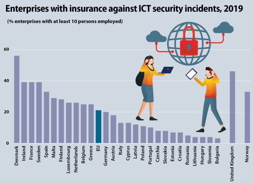 La nivelul uniunii europene, 21% dintre companiile care au cel puțin 10 angajați au asigurare în caz de incidente IT. Aproximativ 5% din companiile cu mai mult de 10 angajați din România sunt asigurate și sub noi sunt doar Lituania, Ungaria, Slovenia și Bulgaria.