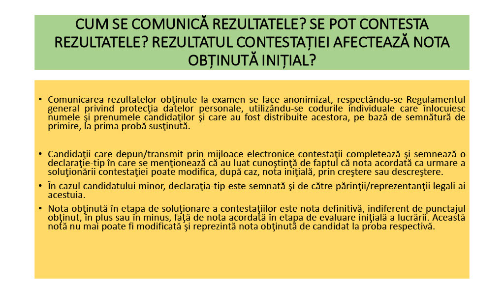 Contestațiile pot fi depuse la centrele de examen sau transmise prin mijloace electronice, în zilele de 28 iunie (în intervalul orar 16:00 – 19:00) și 29 iunie (în intervalul orar 8:00 – 12:00).