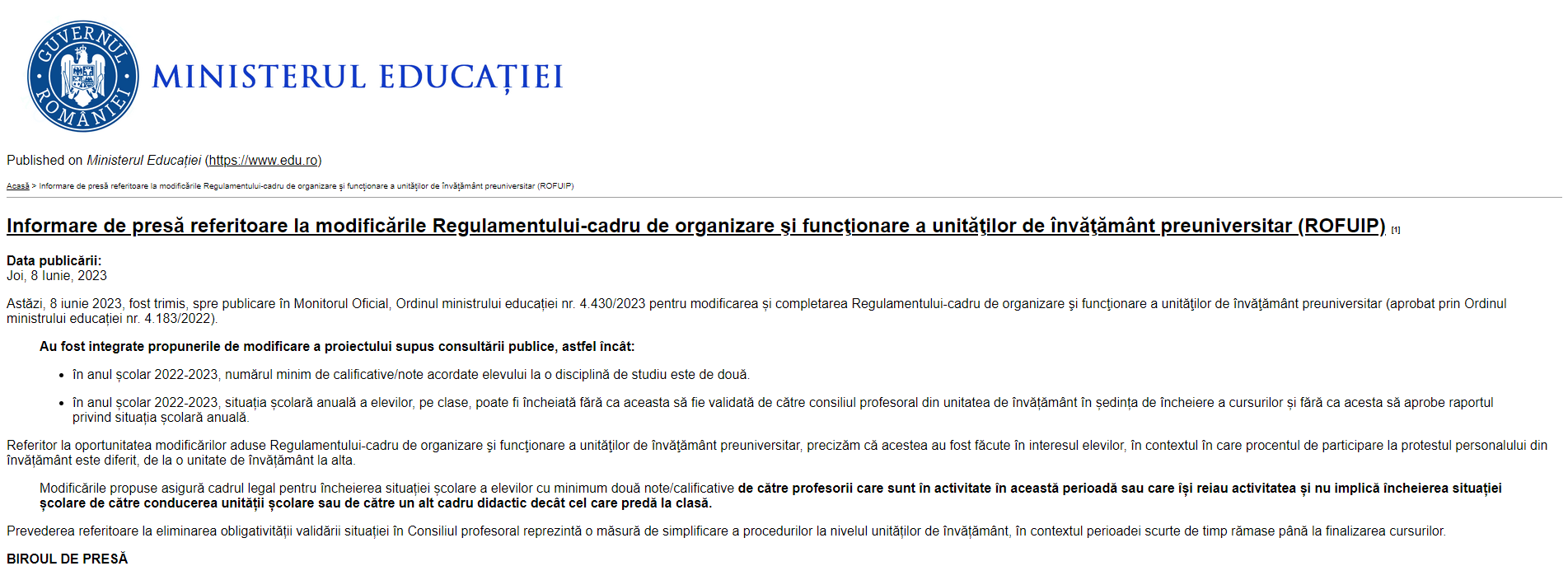 „Având în vedere contextul actual, am semnat Ordinul de Ministru prin care pentru clasele a XIII-a, XII-a și a XIII-a pentru seral și frecvență redusă perioada de încheiere a situației școlare se prelungește până pe 13 iunie. În ceea ce privește celelalte clase nu se impun în acest moment modificări în ceea ce privește desfășurarea activităților de final de an școlar. În ceea ce privește înscrierea la examene: înscrierile pentru examenul de Bacalaureat și Evaluare Națională – pentru absolvenții de clasa a VIII-a – se vor prelungi și ele până pe 13 iunie. În acest context, probele de competențe din cadrul examenului de Bacalaureat se vor susține în perioada 14 – 23 iunie”, a explicat ministrul Educației.
