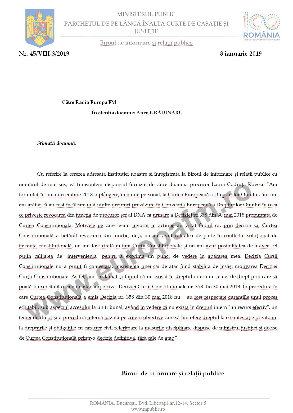 Cu referire la cererea adresată instituției noastre și înregistrată la Biroul de informare și relații publice cu numărul de mai sus, vă transmitem răspunsul furnizat de către doamna procuror Laura Codruța Kovesi: