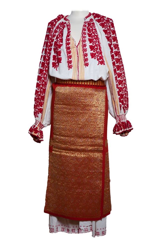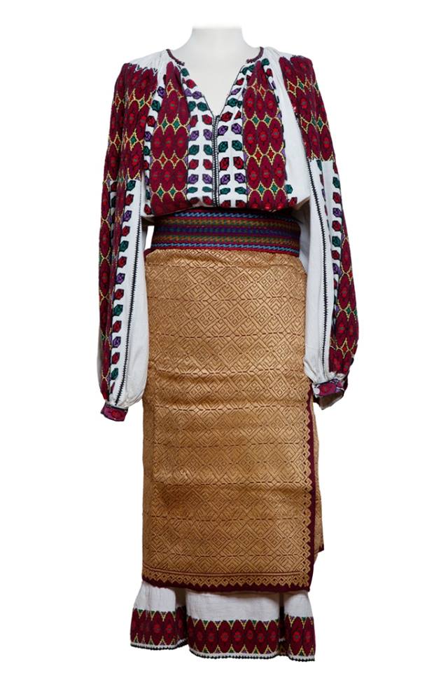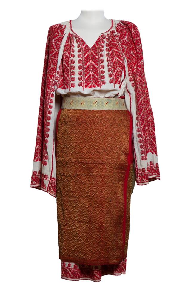Bluza, realizată în perioada anilor 1915-1925, este decorată cu frunze, trandafiri și trifoi cu patru foi. Fustarul are modele florale și broderie cu trandafiri. Manșetele se prind cu năsturei de sidef. Produs unicat, original, în stare bună.