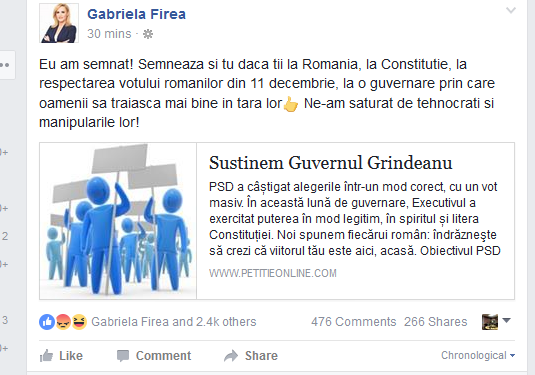 Primarul Capitalei, Gabriela Firea, îi îndeamnă pe români să semneze o petiție online pentru susținerea Guvernului Grindeanu, contestat în stradă de sute de mii de români după ce a adoptat ordonanța de urgență privind modificarea codurilor penale.