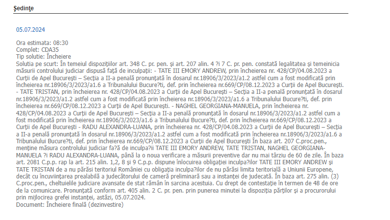Tribunalul București a decis, vineri – 5 iulie 2024 – să înlocuiască interdicția impusă fraților Tate de a nu părăsi România Totuși, frații Tate au obligația de a nu părăsi Uniunea Europeană. Decizia nu este definitivă și poate fi contestată în 48 de ore. Fraţii Andrew şi Tristan Tate nu pot părăsi România până la decizia definitivă.