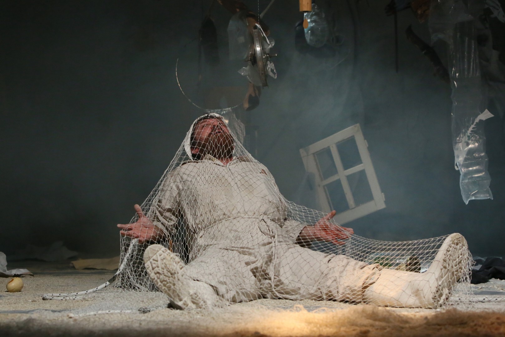 Povestea celebrului personaj biblic înghițit de un pește uriaș, din burta căruia încearcă să evadeze, doar pentru a se trezi prizonier într-o burtă și mai mare, poveste pe care Marin Sorescu o transformă într-una dintre cele mai cunoscute piese din dramaturgia românească, „Iona” devine în viziunea regizorului Tompa Gábor un spectacol poetic, în care muzica Adei Milea, creează un univers aparte, care combină absurdul tragic și umorul (foto: Mihaela Marin).