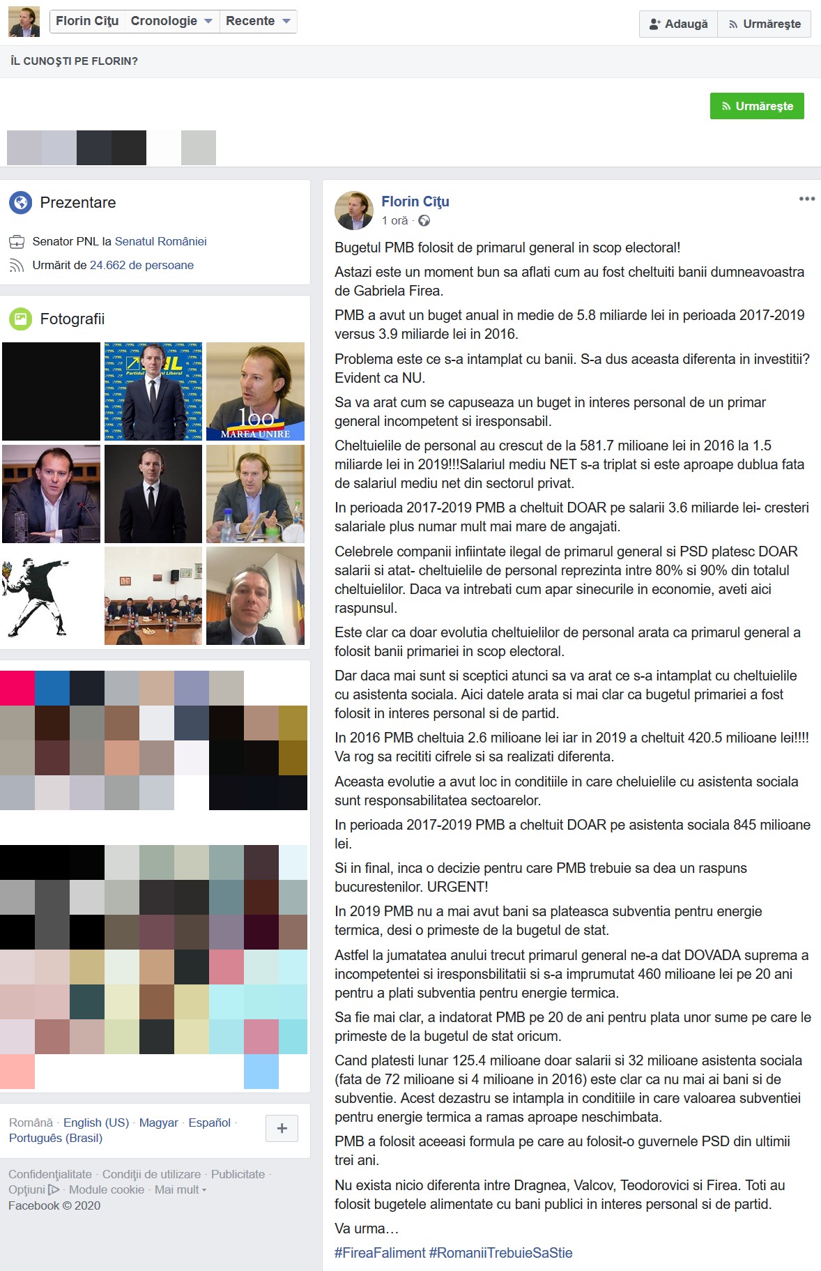 Sâmbătă dimineață, Florin Cîțu a scris pe Facebook cum consideră că este folosit bugetul Primăriei ”de primarul general în scop electoral”.