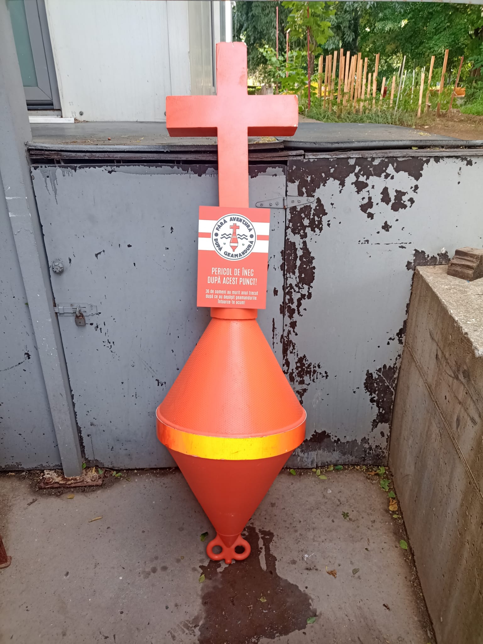 Geamandura portocalie, de înălțimea unui om, are în partea superioară forma unei cruci. Mai jos, un logo „Fără aventură, după geamandură”.