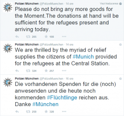Poliția din Munchen cere germanilor să nu mai aducă donații pentru refugiații care sosesc cu trenul, scrie The Independent. Polițiștii au fost copleșiți de haine, pachete cu hrană, scutece și jucării, la mai puțin de o oră după ce autoritățile au anunțat pe Twitter că în gara din Munchen au ajuns primii refugiați, iar oamenii pot face donații.