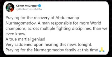 “Mă rog pentru însănătoşirea lui Abdulmanap Nurmagomedov, un om responsabil pentru foarte mulţi campioni mondiali la diferite discipline. Un adevărat maestru în artele marţiale. Sunt foarte trist să aud această veste. Mă rog pentru familia Nurmagomedov”, a spus Conor McGregor, pe Twitter.
