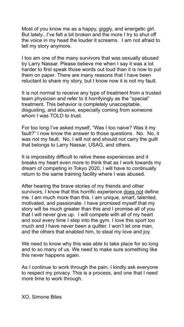 Simone Biles, considerată una dintre cele mai bune gimnaste din toate timpurile, a publicat o scrisoare pe contul său de twitter în care recunoaște că este una dintre supraviețuitoarele abuzurilor lui Larry Nassar.