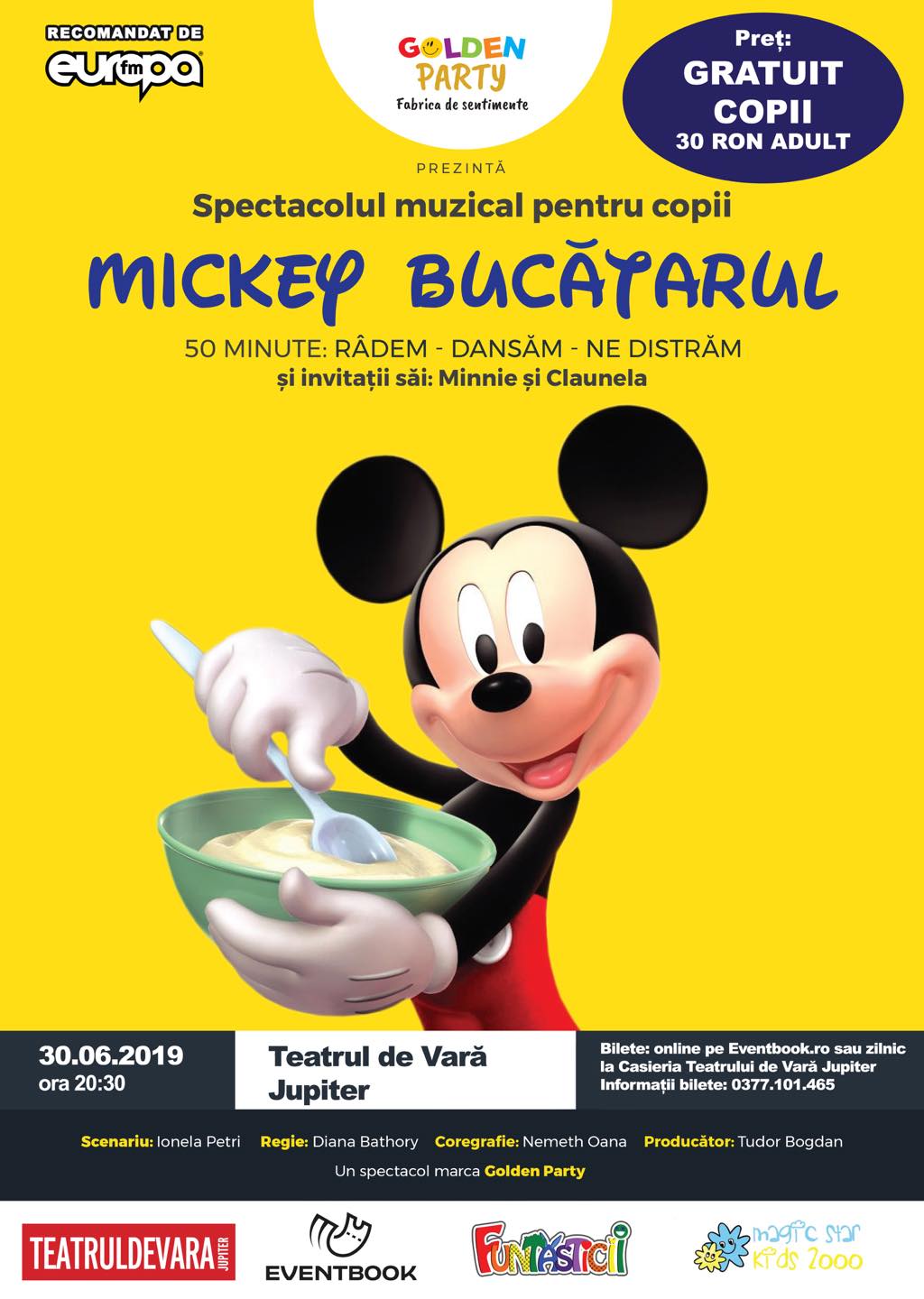 Duminică, 30 iunie, și marți, 2 iulie, Mickey și prietenii săi vin pe litoral, la Teatrul de Vară din Jupiter pentru un spectacol în care cei mici vor intra în mijlocul unei povești captivante. În plus, duminică seara copiii au accesul gratuit la spectacolul ”Mickey Bucătarul”.