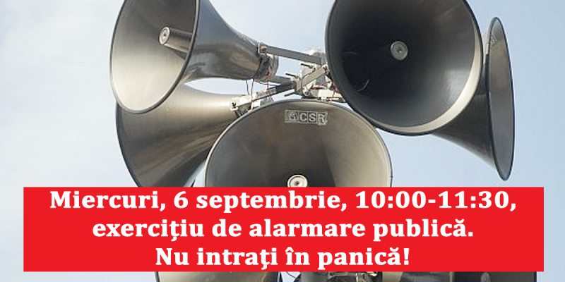 Inspectoratul General pentru Situații de Urgență anunță că, miercuri, în intervalul orar 10.00-11.00, se va desfăşoară un nou exerciţiu național de înştiinţare, avertizare şi alarmare în situaţii de urgenţă.