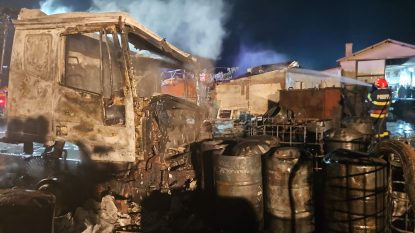 Incendiu devastator, cu explozii, seara trecută, într-un parc auto de la marginea localității 2 Mai, județul Constanța. Mai multe tiruri cu bitum, microbuze, remorci și butoaie cu combustibil lichid s-au făcut scrum. Din cauza degajărilor uriașe de fum, autoritățile au emis mesaj RoAlert și au cerut populației să ocolească sau să evite zona.