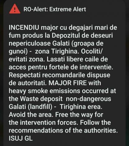 Incendiu de proporții la groapa de gunoi de lângă Galați. Se manifestă cu mare degajare de fum. A fost emis mesaj RO Alert.