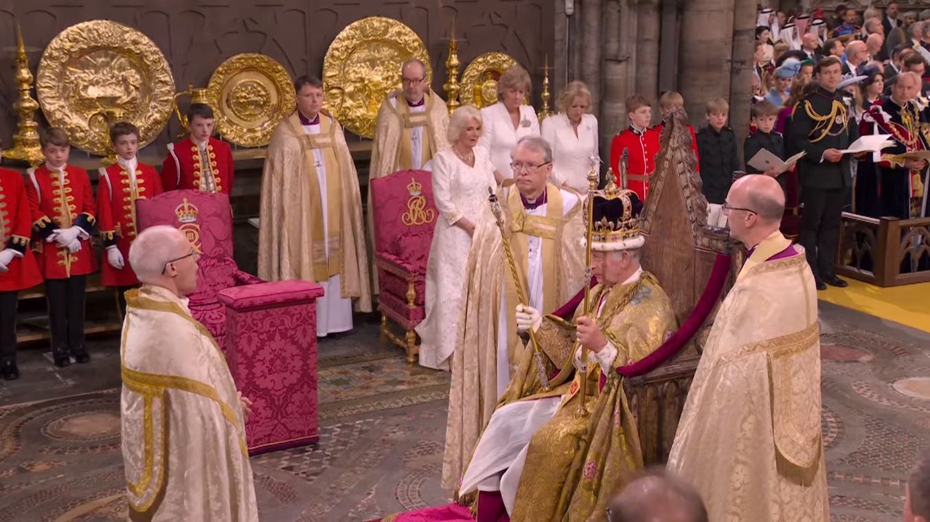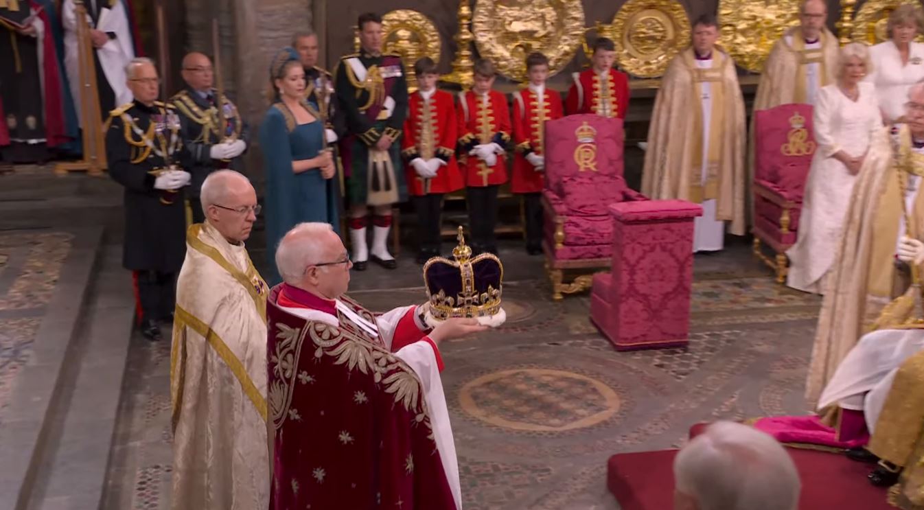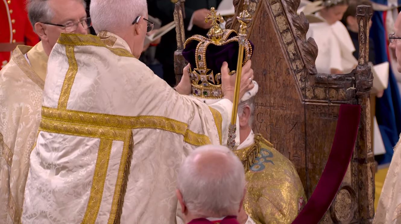 Coroana Sfântului Eduard este așezată pe capul regelui de către Arhiepiscopul de Canterbury, iar acesta este încoronat oficial.