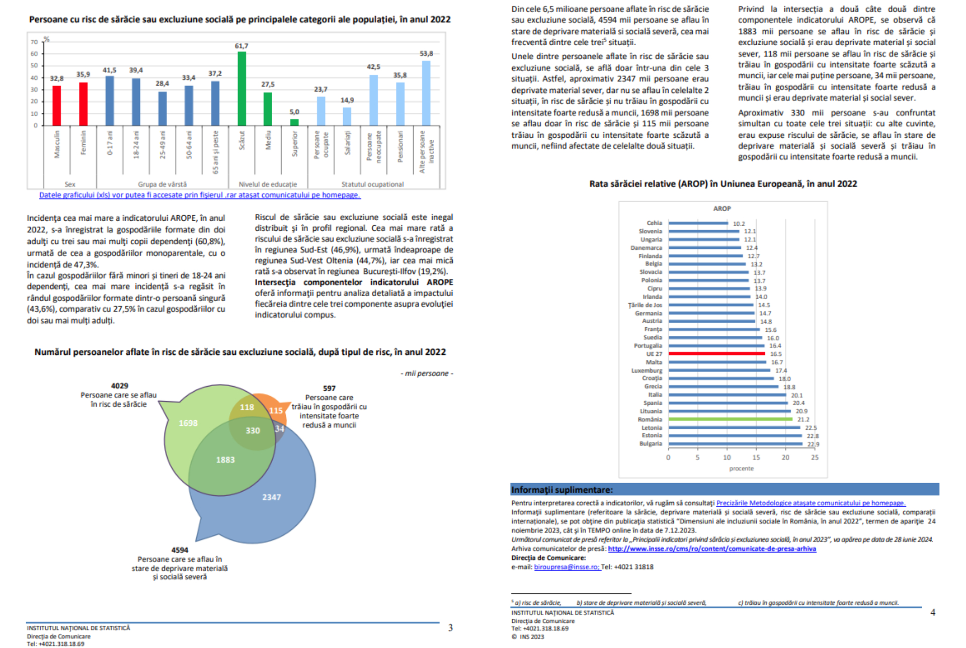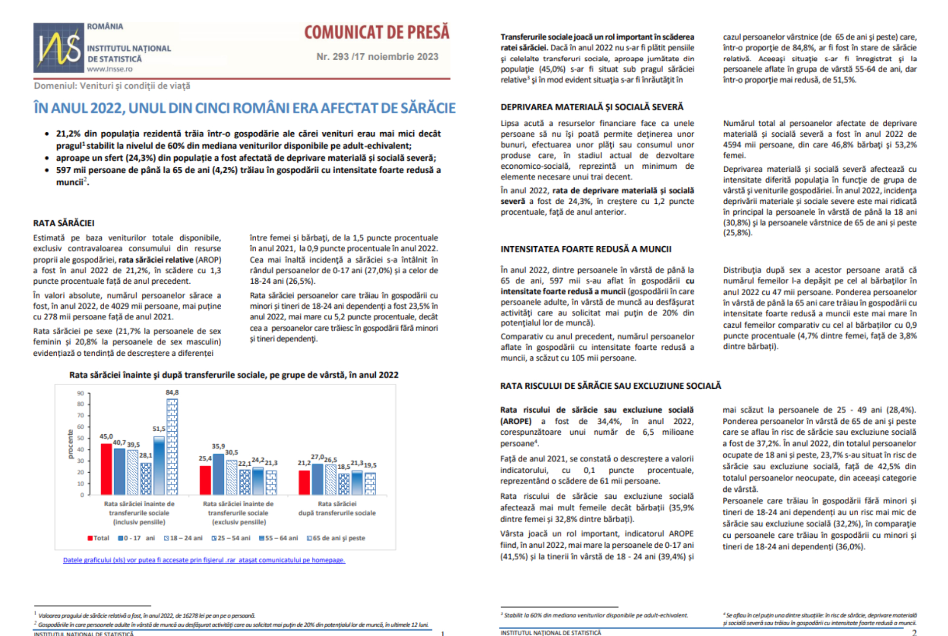Rata sărăciei persoanelor care trăiau în gospodării cu copii și tineri de 18 până la 24 de ani dependenți a fost 23,5% în anul 2022, mai mare cu 5,2 puncte procentuale, decât cea a persoanelor care nu aveau în întreținere alți membri ai familiei.