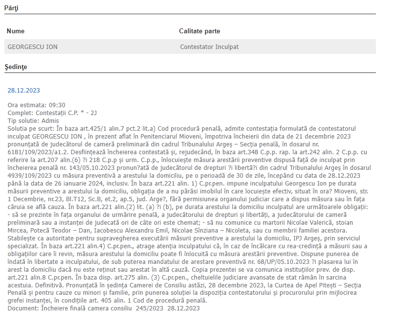 Contestația formulată de Ion Georgescu a fost admisă joi, 28 decembrie 2023, contestație împotriva deciziei anterioare de arestare preventivă luată la data de 21 decembrie de judecătorul de cameră preliminară de la Tribunalul Argeș, secția Penală.