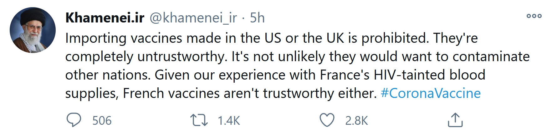 Nu este imposibil ca ei să îşi dorească să contamineze alte naţiuni”, scrie într-un mesaj al Ayatollahului Ali Khamenei postat pe contul său de Twitter în engleză.