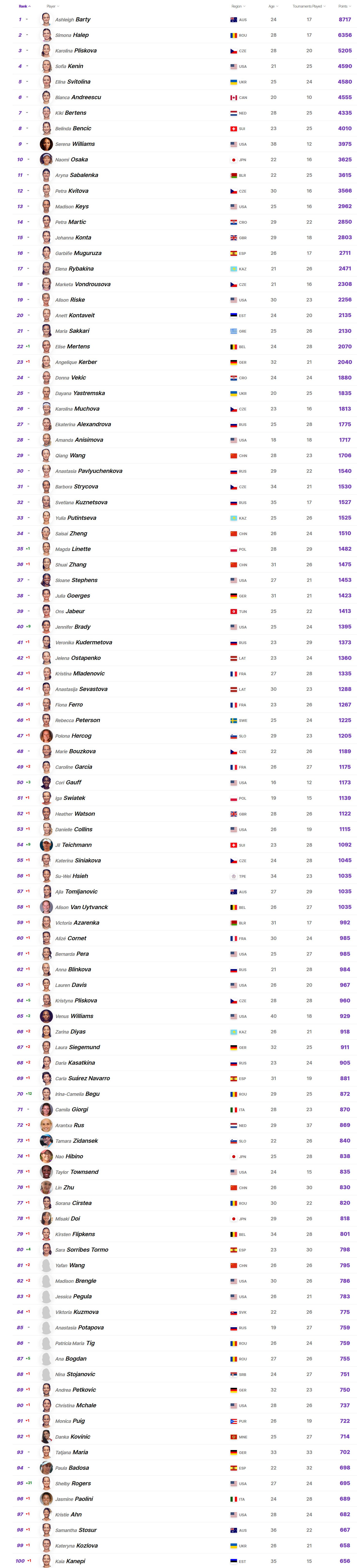 Pe primul loc în clasamentul mondial WTA se menține Ashleigh Barty (Australia) cu 8.717 puncte. Ea este urmată de Simona Halep cu 6.356 de puncte și de Karolina Pliskova (Cehia), cu 5.205 puncte.
