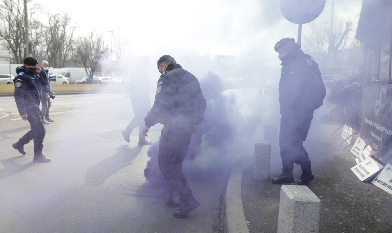 La un moment dat, unii manifestanți au aruncat cu fumigene și i-au acuzat pe jandarmi că au primit ordine să îi bruscheze.