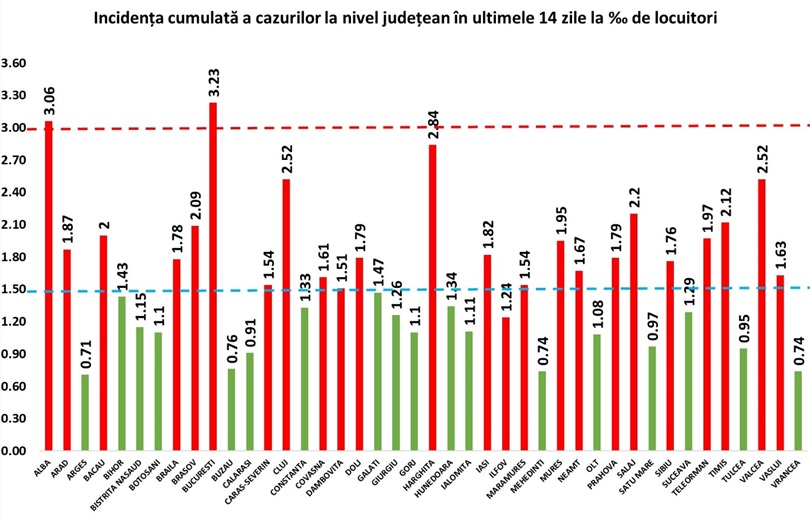 Foarte aproape de scenariul roșu este și județul Harghita, unde indicele este de 2,84 la mia de locuitori.
