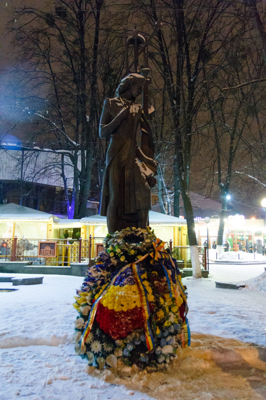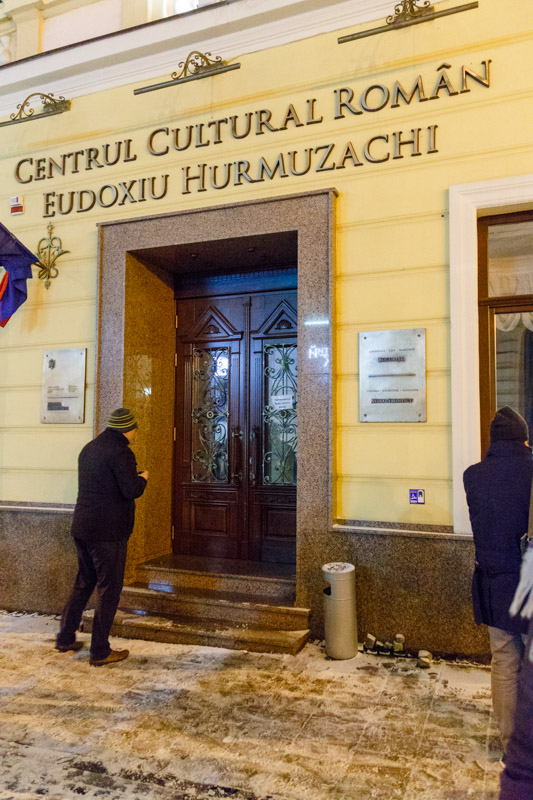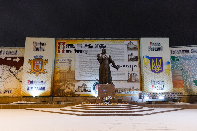 Începând cu anul 2000, la împlinirea a 150 de ani de la naşterea poetului, în spatele fostului Palat Cultural Român este amplasată statuia lui Mihai Eminescu. Monumentul este realizat de un sculptor cernăuţean, Dumitru Gorscovski.