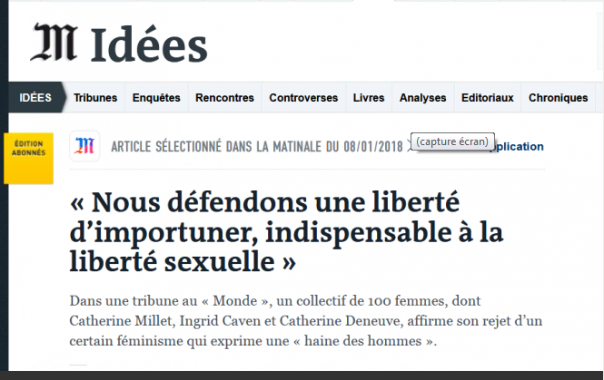 Cele 100 de actrițe, scriitoare, cercetătoare sau ziariste din Franța care au fost citate de cotidianul francez „Le Monde” au prezentat aceste reacții ca urmare a scandalului sexual mondial, cunoscut și răspândit pe internet sub numele „#MeToo”.