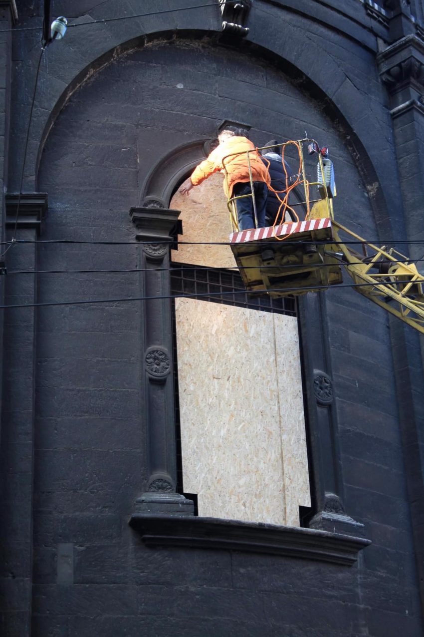 Cu obloane de lemn au fost protejate și vitraliile de la Biserica Sf Antonie.