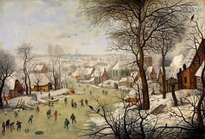 Peisaj de iarnă cu patinatori și capcană pentru păsări descrie petrecerea timpului liber într-o aşezare străbătută de un râu îngheţat”.