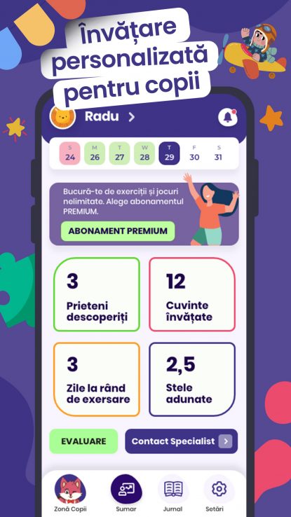VoxiKids este o aplicație pentru mobil și tabletă. Copiii pot exersa zilnic de oriunde, singuri sau cu sprijinul părinților, într-un format interactiv, distractiv și util.