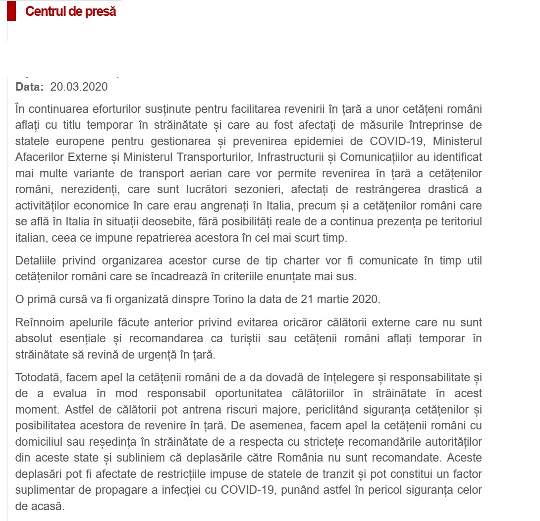 Potrivit MAE, împreună cu Ministerul Transporturilor, Infrastructurii și Comunicațiilor au fost identificate mai multe variante de transport aerian care vor permite revenirea în țară a românilor nerezidenți, care sunt lucrători sezonieri, afectați de restrângerea drastică a activităților economice în care erau angrenați în Italia, precum și a cetățenilor români care se află în Italia în situații deosebite.