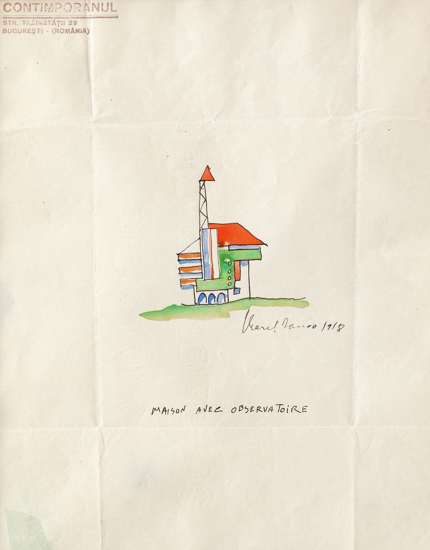 O altă lucrare a reputatei perioade, de data aceasta înfățișând o eboșă de arhitectură cubistă, undeva între o fantezie constructivistă și o prelucrare „a la Corbusier” a prototipului casei balcanice, interese ce au preocupat arhitectura lui Marcel Iancu în perioada interbelică, „Maison avec Observatoire”, datează din ultimul an al războiului, 1918, și are un preț de pornire în licitație de 600 de euro.