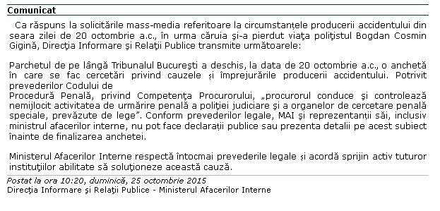Ministerul de Interne reacționează în cazul polițistului care a murit, în urmă cu 5 zile, în timp ce se afla în coloana oficială a ministrului Gabriel Oprea. Tânărul deschidea calea mașinii oficiale, când a intrat într-o groapă de pe bd. Stribei Vodă din Capitală.