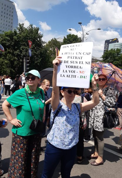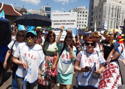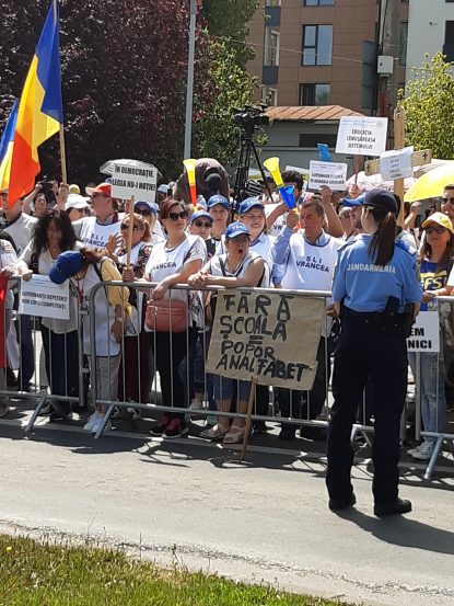 “Ne aflăm aici pentru că am ajuns cumva cu cuțitul la os, pentru că nu mai putem trăi din aceste salarii, pentru că o colegă, mămică, are acum indemnizația de creștere a copilului 2416 lei, altă colegă care nu a avut ore suplimentare are 2000 de lei și nu se poate trăi așa. Nu poți să aștepți calitate în educație de la mame disperate că n-au cu ce să-și hrănească copiii. Iar guvernanții nu fac decât să-și bată joc de noi. Oferă pomeni și vouchere când noi cerem salarii și viață decentă că să ne putem educa elevii.“